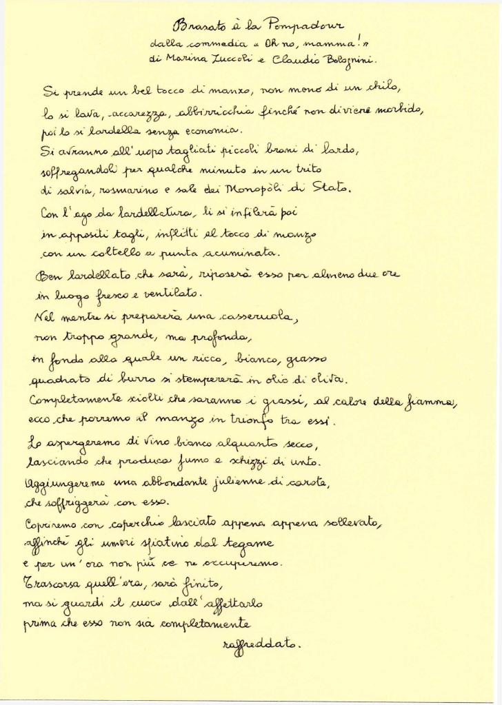 Chi avrà voglia di leggerla troverà una parola che non esiste sui vocabolari (a voi la ricerca) e una inquietante scelta del vino bianco per il brasato. Vorrei poter dire che a Madame Pompadour riusciva indigesto il tannino del rosso, ma sarebbe un’ulteriore invenzione.