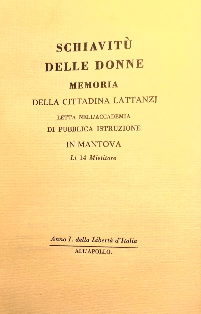 Nasce a Firenze nel 1771 da una famiglia di modeste condizioni, sposa nel 1788 lo scrittore e politico giacobino Giuseppe Lattanzi, da cui, sembra, sia stata incentivata a scrivere. I repertori che la citano la definiscono, infatti, poetessa, scrittrice e giornalista. In realtà, come poetessa, le viene attribuita solo una raccolta di versi, Cantici, pubblicati nel volume Omaggio poetico di vari autori per l’Imeneo di Napoleone con Maria Luigia d’Austria, uscito a Venezia nel 1810. Ma vediamo quale novità contiene il suo discorso sulla schiavitù delle donne, pubblicato in seguito come opuscolo e dedicato a Josephine, moglie di Napoleone – “liberateur de notre pays” – , perché potesse farsi portavoce della situazione di sottomissione – “esclavage” – delle donne italiane.