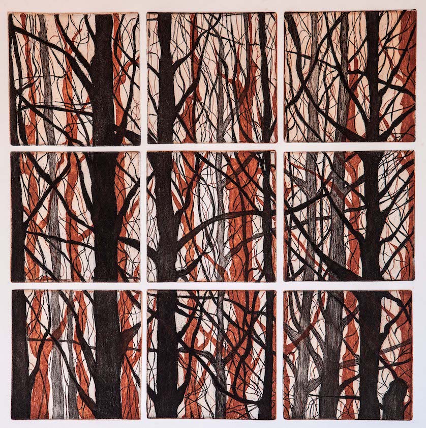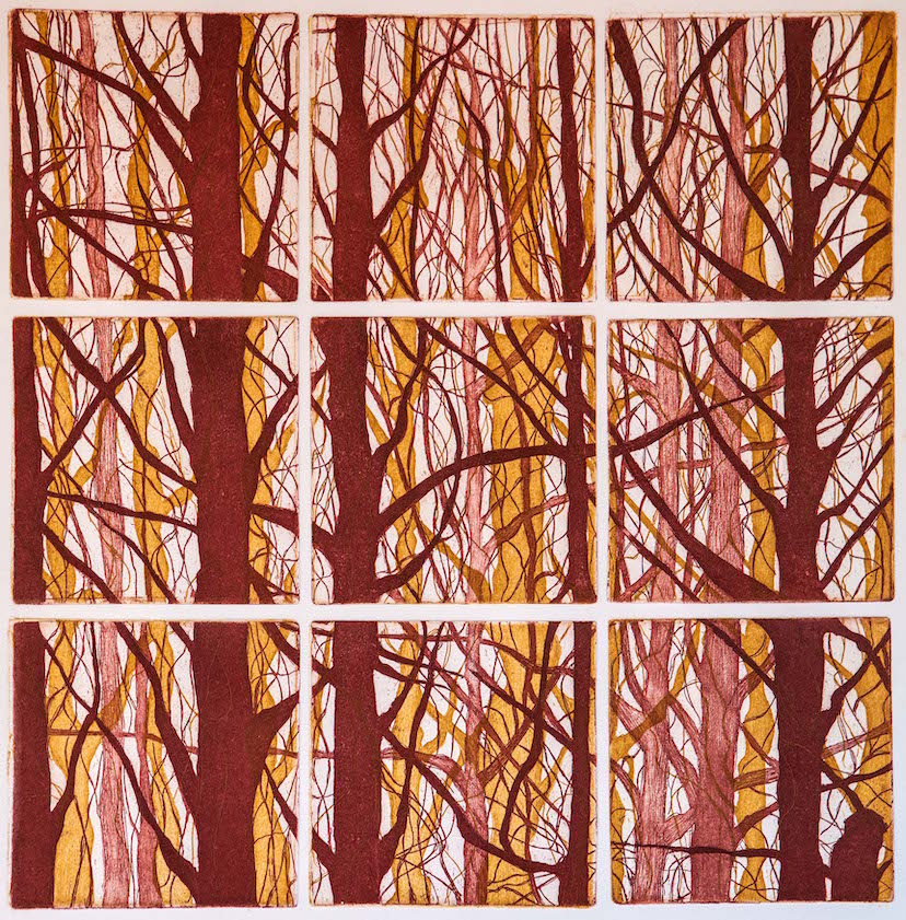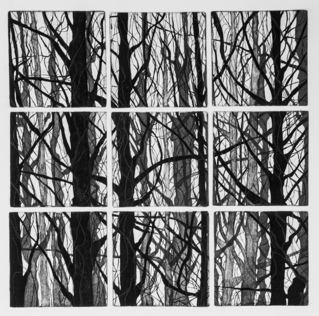 Spesso accade che la prima cosa che si vede al risveglio, o qualche sogno notturno siano irresistibili stimoli per il disegno. Così una finestra di un rifugio con la vista su un bosco autunnale è stata il soggetto di queste 5 incisioni. Le matrici calcografiche sono le stesse, cambiano solo i colori delle 4 stagioni, a cui non ho resistito ad aggiungerne una quinta quasi in bianco e nero.
