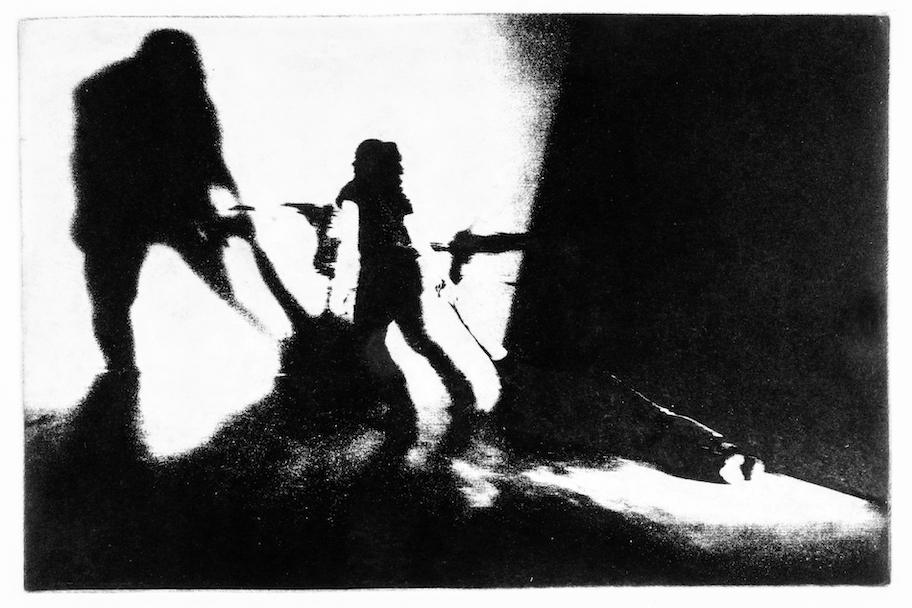 Le stampe di “La parte dell’ombra”, 2022: Ogni lastra è di cm. 20X30 su fogli di cm. 35×50, realizzate in 4 copie numerate; inoltre 2 stampe di cm. 50X70 contengono le 4 matrici.