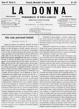Se oggi ancora ci meravigliamo che le donne ricoprano posti di grande responsabilità e siano protagoniste di imprese memorabili al pari degli uomini, distinguendosi in tutti i campi delle professioni, è perché ci dimentichiamo o forse ignoriamo che l’emancipazione femminile ha alle spalle quasi due secoli di battaglie che hanno visto sì alcune sconfitte, ma anche tante conquiste. Per valorizzare questa storia è giusto ricordare il più importante periodico italiano del movimento per l’emancipazione femminile – La Donna – fondato nel 1868 da una giovane scrittrice e giornalista, Gualberta Alaide Beccari, che riuscì con grandi sacrifici personali e impegno instancabile a tenerlo in vita fino al 1890. Fulcro del suo progetto era la scelta di una redazione tutta al femminile e di una schiera di collaboratrici, tutte donne, poetesse e scrittrici di ispirazione spesso distante fra loro, come Eva Cattermole e la Fuà Fusinato insieme a insegnanti, pedagogiste, “eletti ingegni femminili “ che avevano abbracciato il pensiero mazziniano, come Elena Ballio e Giorgina Craufurd Saffi ed ancora le emancipazioniste come Anna Maria Mozzoni che sulla rivista trovò il mezzo più sicuro e disponibile per la diffusione delle sue idee. La Beccari, fondatrice e direttrice della rivista, aveva deciso, infatti, di fare a meno del punto di vista maschile, scegliendo per ogni argomento una impostazione femminile. Il sottotitolo, peraltro, – Periodico di educazione compilato da donne italiane” – rivelava chiaramente che la sua finalità era prevalentemente pedagogica, soprattutto nei confronti delle giovani italiane. Ben presto, tuttavia, divenne un vero e proprio organo di lotta democratica perché, nel più puro spirito mazziniano, la Beccari pensava che il rinnovamento del giovane Stato italiano non poteva non passare dalla presenza consapevole e dall’impegno sociale e politico delle donne. Gualberta era cresciuta a pane e idee mazziniane, essendo suo padre un fervente seguace di Mazzini che predicava la parità delle donne nei diritti come nei doveri e così, quando per contribuire a dare voce al nascente movimento emancipazionista, decise di fondare la rivista, questa divenne lo spazio in cui si dibattevano liberamente i temi e i valori legati prevalentemente alla condizione della donna, senza censure e pregiudizi e con uno stile epistolare che facilitava la comunicazione fra il giornale e le sue lettrici. Grazie al clima di solidarietà e di complicità che, con l’esclusione degli uomini, la fondatrice/direttrice aveva instaurato, le lettrici, sparse in quasi tutte le regioni della nuova Italia, avevano una tale fiducia nella rivista che partecipavano e si esprimevano come le collaboratrici più colte, arricchendone le pagine con i loro interventi, a volte anche in forma narrativa e poetica, cosicchè il giornale diventò, in particolare fra gli anni ‘70 e ’80, anche testimone dei cambiamenti sociali che stavano avvenendo. Gli argomenti andavano dall’istruzione all’educazione, dal lavoro femminile alle condizioni economiche e sociali delle donne sempre inferiori a quelle degli uomini, fino alle questioni del divorzio e della prostituzione. La rivista aveva un taglio impegnato e non mancava di fornire notizie di attualità, articoli scientifici e letterari e informazioni da tutto il mondo sulle lotte del femminismo. La Donna resistette dal 1868 al 1891 ma fu anche fonte di scandalo e di critiche in particolare quando si battè per la riforma elettorale raccogliendo migliaia di firme per la sottoscrizione della petizione a favore del suffragio universale. La sua fondatrice e direttrice, ormai stanca, malata e ridotta in povertà morì nel 1906 a Bologna, dove aveva vissuto la maggior parte della sua vita, e solo grazie all’iniziativa di un comitato di influenti signore bolognesi, fra cui alcune collaboratrici della rivista, il sindaco le procurò una degna sepoltura nel cimitero della Certosa. L’emancipazionismo postunitario che la rivista aveva rappresentato con tanto impegno stava ormai lasciando il posto alle battaglie del nascente socialismo.