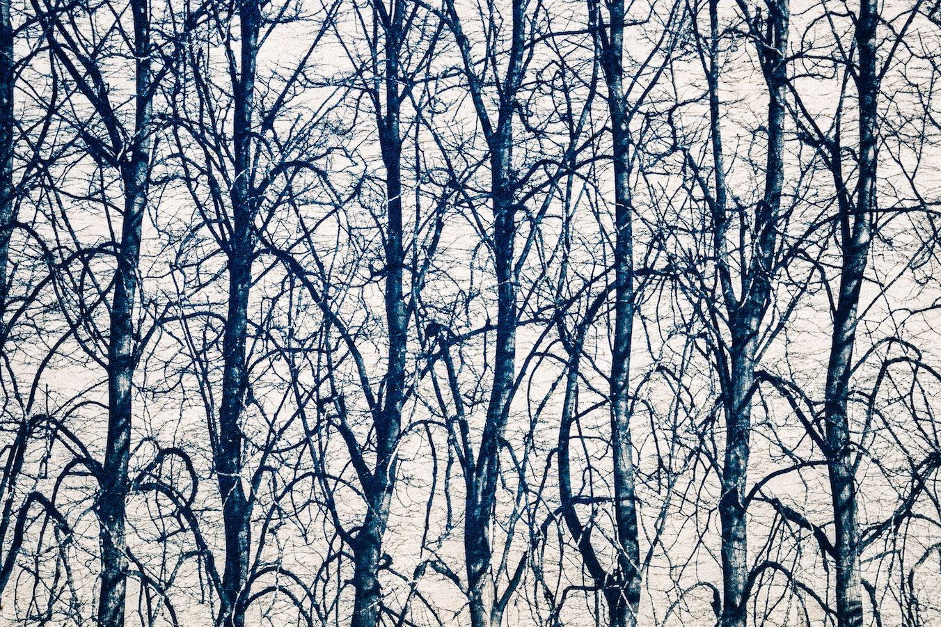 Un’altra poesia di Laura Anfuso: «l’albero / sale i rami / l’azzurro sporge / pure le radici / mai dimentica / ché il tronco abbraccia / e d’ombra calma / scende carezza». Accanto alcune cianografie di legioni di foglie cadute, geometrie ramificanti, chiome di pini e forse la mia preferita, quattro singolari e giovani pioppi lombardi cipressini intorno ad una panchina solitariamente sgombra. Non ci sono mai umani in questi scatti, l’uomo è lontano, espulso, resta solo nelle parole che cercano di incidere sulla carta come se fosse il becco d’un picchio che segna la corteccia d’un albero.