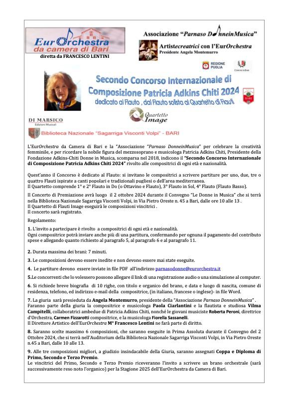 L’Associazione che, come ho già sottolineato, ha anche dei collegamenti a livello mondiale con le altre Associazioni di donne artiste attraverso la rete delle Donne in Musica, nel proprio statuto riporta la dichiarazione di Fiuggi della Fondazione Adins-Chiti -Donne in Musica, al cui spirito si ispira. Sin dalla sua nascita ParnasoDonneinMusica ha dato vita a innumerevoli concerti e manifestazioni dedicati alla creatività femminile e ha creato un Concorso Internazionale di Composizione dedicato a Patricia Adkins Chiti. Inoltre programma convegni, studi, ricerche e quant’altro possa servire alla realizzazione nel mondo del principio di pari opportunità, che è collegato alla valorizzazione e inveramento di tutti gli altri principi di parità sociale, culturale e di concordia civile.