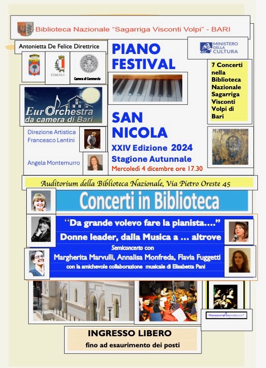 “Da grande volevo fare la pianista…” : tre donne leader si raccontano, per i “Concerti in Biblioteca” dell’EurOrchestra, mercoledì 4 Dicembre alle 17:30 nell’Auditorium della Biblioteca Nazionale, in Via Pietro Oreste n.45 a Bari.