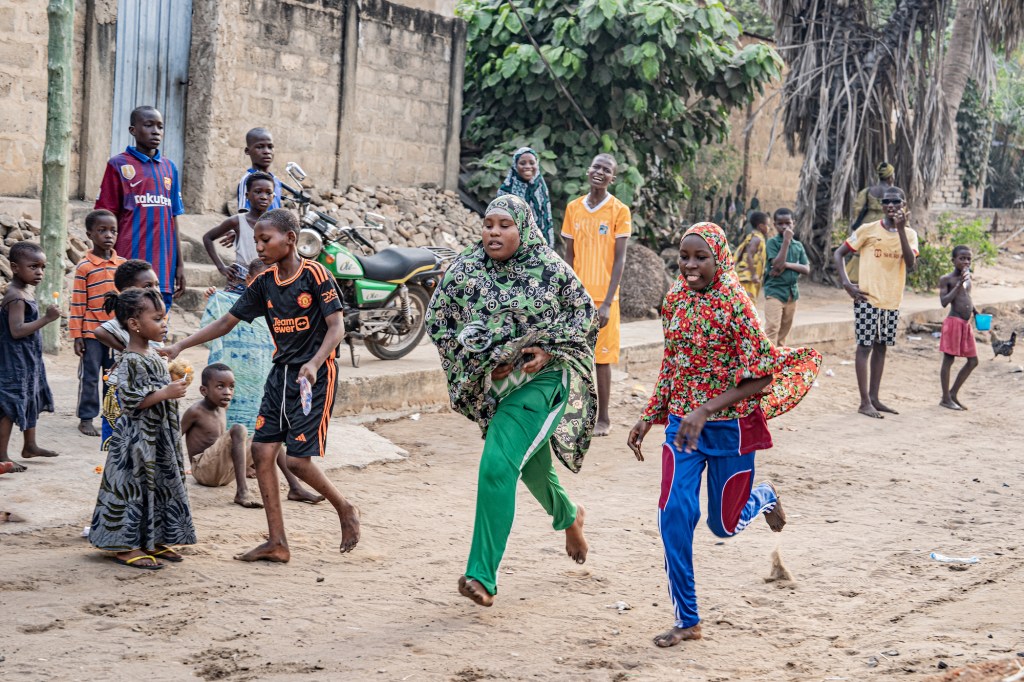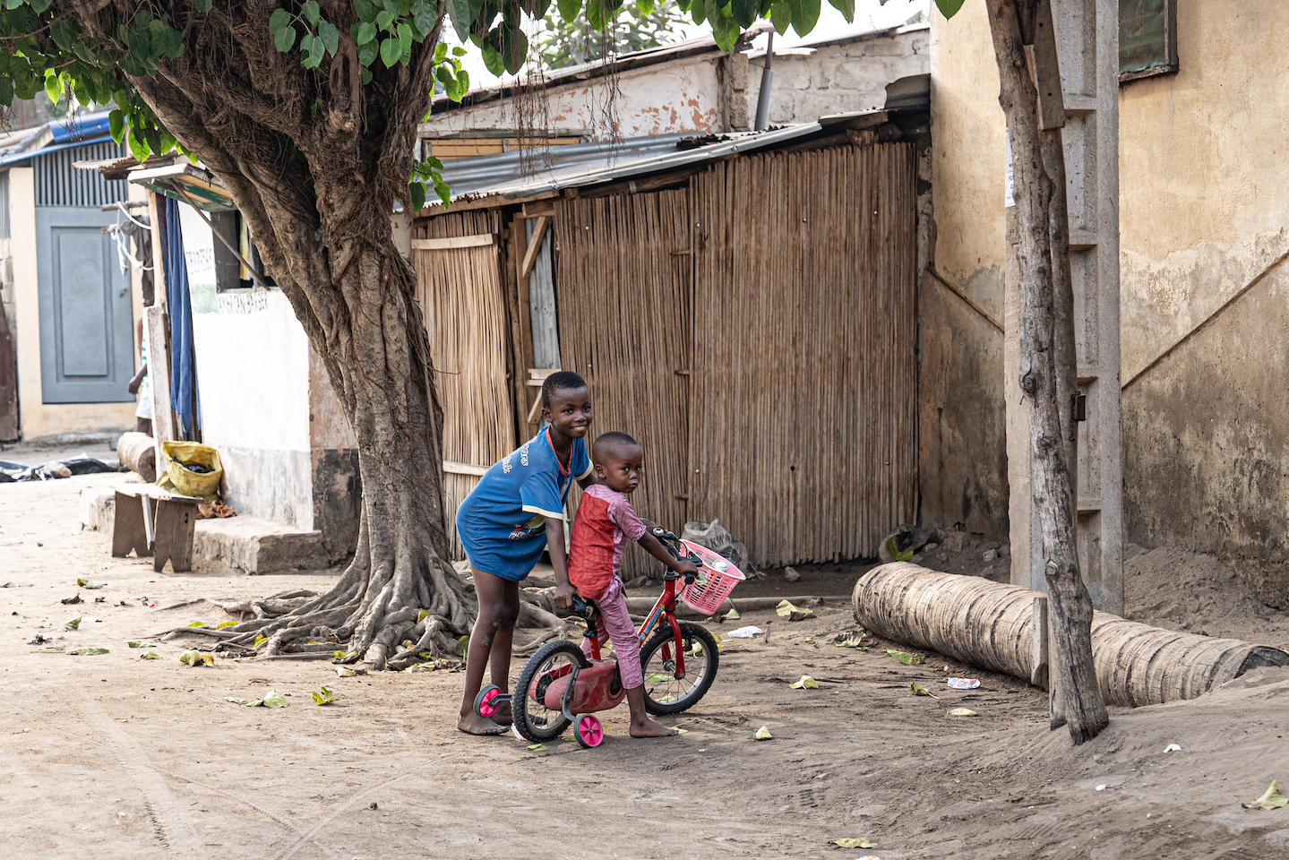 Poi ci sono i bambini. Scalzi o no, vestiti bene o male. In tenera età nei giochi non paiono che vengano considerate differenze di genere (sicuramente meno che da noi): le bambine giocano a pallone con i maschi anche quando sono palesemente di religione islamica – lo si vede dall’abbigliamento -, fanno le gare di corsa con loro e spesso vincono, sono più “scatenate” di loro e non esitano neppure a dare spintoni e ad essere “manesche”. Gli abbigliamenti dei bambini sono i più vari: stracci, cose vecchie e consunte, maglie troppo grandi e troppo piccole, tante magliette di squadre di calcio, che arrivano da fuori con le navi con le quali portiamo in Africa i nostri “ruschi”(in italiano rifiuti!). In questi quartieri nessuno acquista abbigliamento per i bambini. I soldi sono pochi (o nulla); si fa quel che si può e tutto viene riciclato; quel poco che c’è è per la sussistenza.