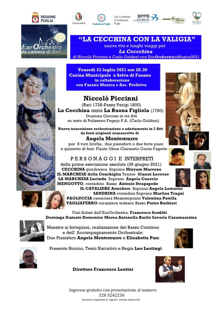 Il 16 gennaio, in occasione delle celebrazioni del 297°compleanno di Niccolò Piccinni organizzate da FAI-Delegazione di Bari, Angela Montemurro ha tenuto una conversazione musicale, seguita da concerto, in cui ha illustrato la vita del grande compositore barese e il suo rapporto di trascrittrice con le fortunate opere del Maestro intitolate al personaggio di Cecchina, ossia “la Cecchina o La Buona figliola” del 1760 e “La Cecchina o la Buona Figliola Maritata” del 1761, ambedue composte su libretti di “Polisseno Fegejo, pseudonimo utilizzato da Carlo Goldoni, data la sua appartenenza alla Accademia di Arcadia, propugnatrice di un ritorno alla poesia bucolica dei pastori-poeti.