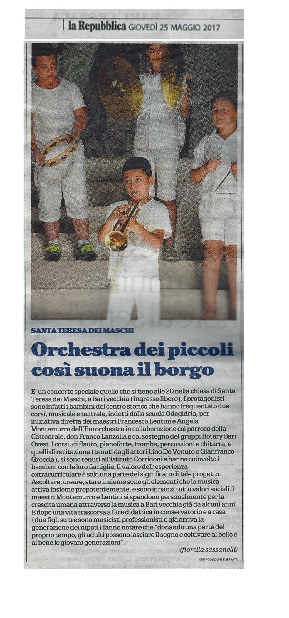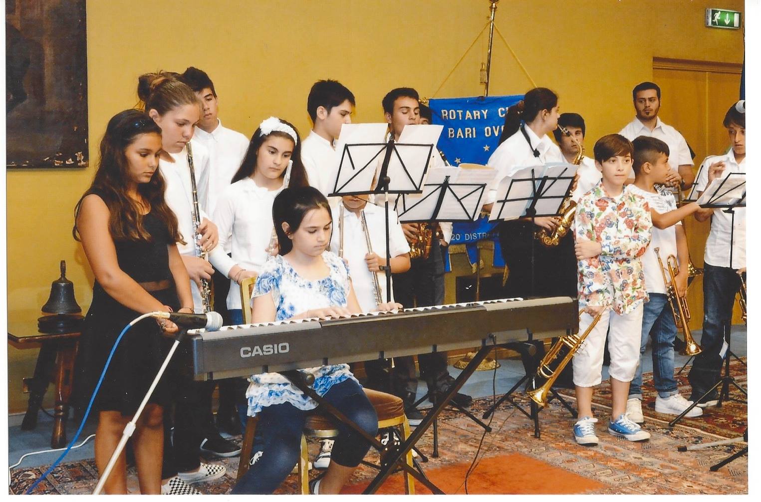 Dal 2010 ad oggi, ogni anno, dapprima nella Chiesa di San Giacomo, annessa alla Cattedrale di Bari, poi nella Scuola Primaria Corridoni, e dall’anno scorso nella Scuola Secondaria San Nicola, sempre nel Borgo Antico di Bari, si svolgono i Corsi gratuiti di Musica, con lezioni settimanali tenute sia da nostri colleghi musicisti che hanno aderito nobilmente alla iniziativa, sia da giovani diplomandi dei Conservatori, o giovani studenti che insieme con noi maestri “anziani” hanno svolto e svolgono dei veri e propri tirocini di insegnamento, sempre come volontari. La Fondazione Rotary ha acquistato gli strumenti da donare alla Scuola, che a sua volta li affida in comodato d’uso agli allievi. Abbiamo creato le classi di teoria e solfeggio, clarinetto, sax, tromba, percussioni, flauto, chitarra pianoforte e musica d’insieme. I risultati sono stati straordinari, in quanto i piccoli allievi si esibiscono in un saggio musicale ogni anno, e l’anno scorso addirittura una piccola banda diretta da mio marito Francesco Lentini ha eseguito l’Inno d’Italia, l’Inno d’Europa e l’inno del Rotary, aprendo una manifestazione rotariana.