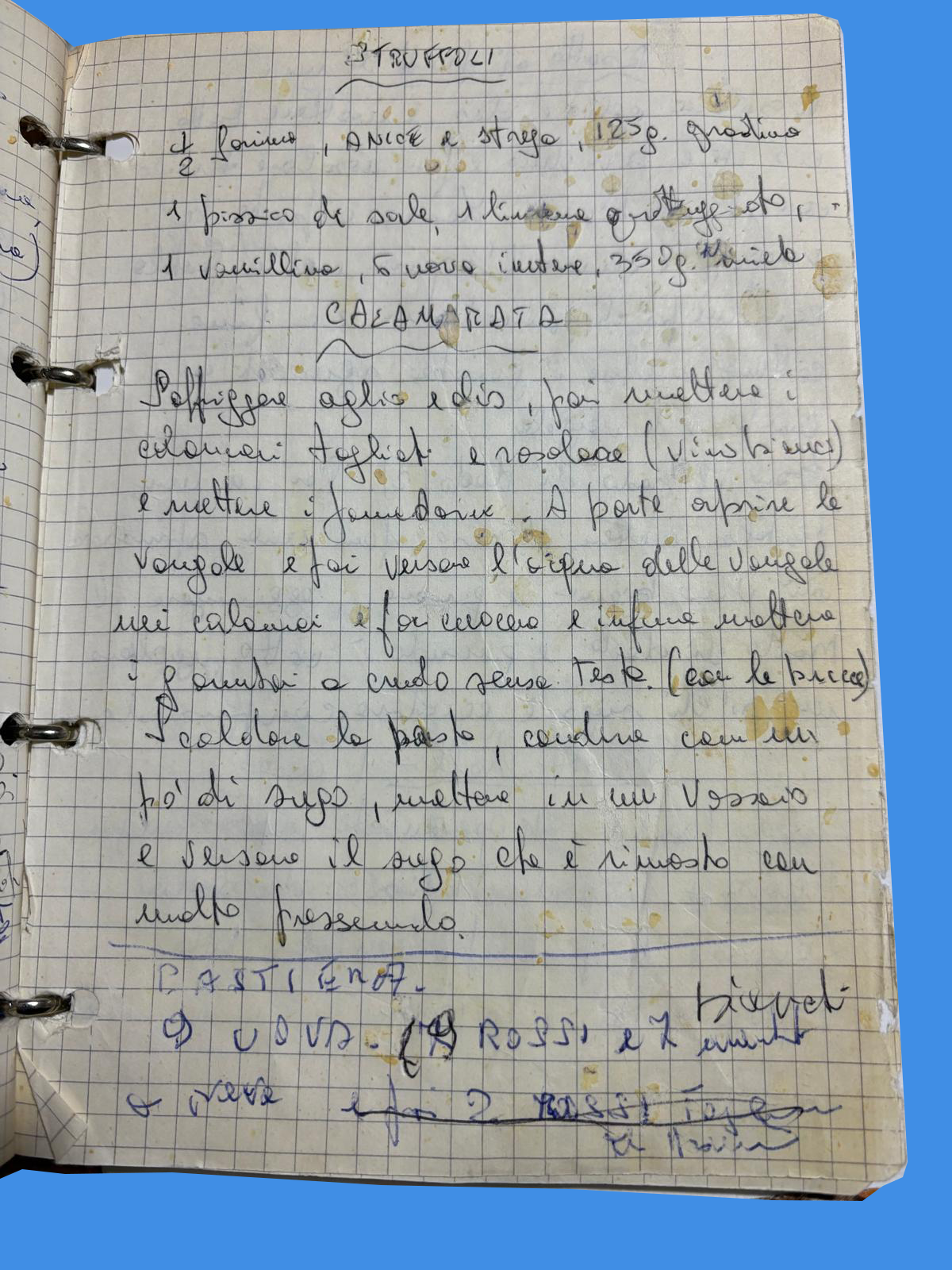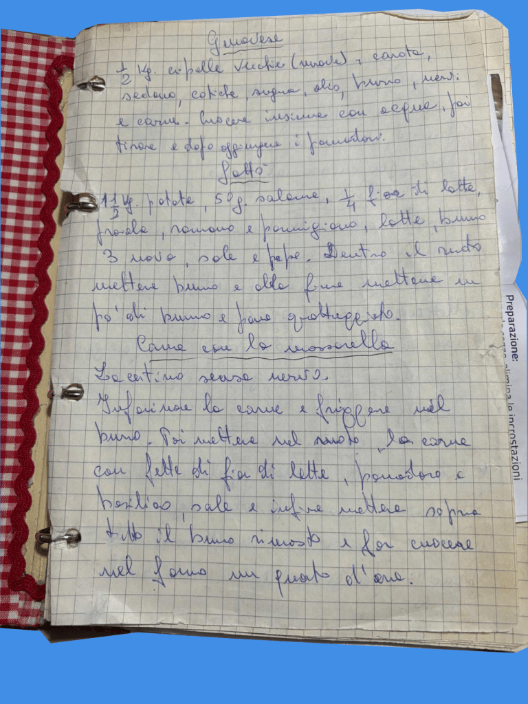 Così sfogliando il quaderno troviamo le tracce del cucinare sulla descrizione della Genovese con l’elenco degli ingredienti, ma di quantità non ne troviamo, perché misura più l’occhio della bilancia, o del Gattò di patate con tanti di quei salumi e mozzarella fiordilatte, oppure della carne alla sorrentina (con la mozzarella) dove il tipo di carne è indicata ma il resto è affidato alla memoria e alla sapienza della vista!