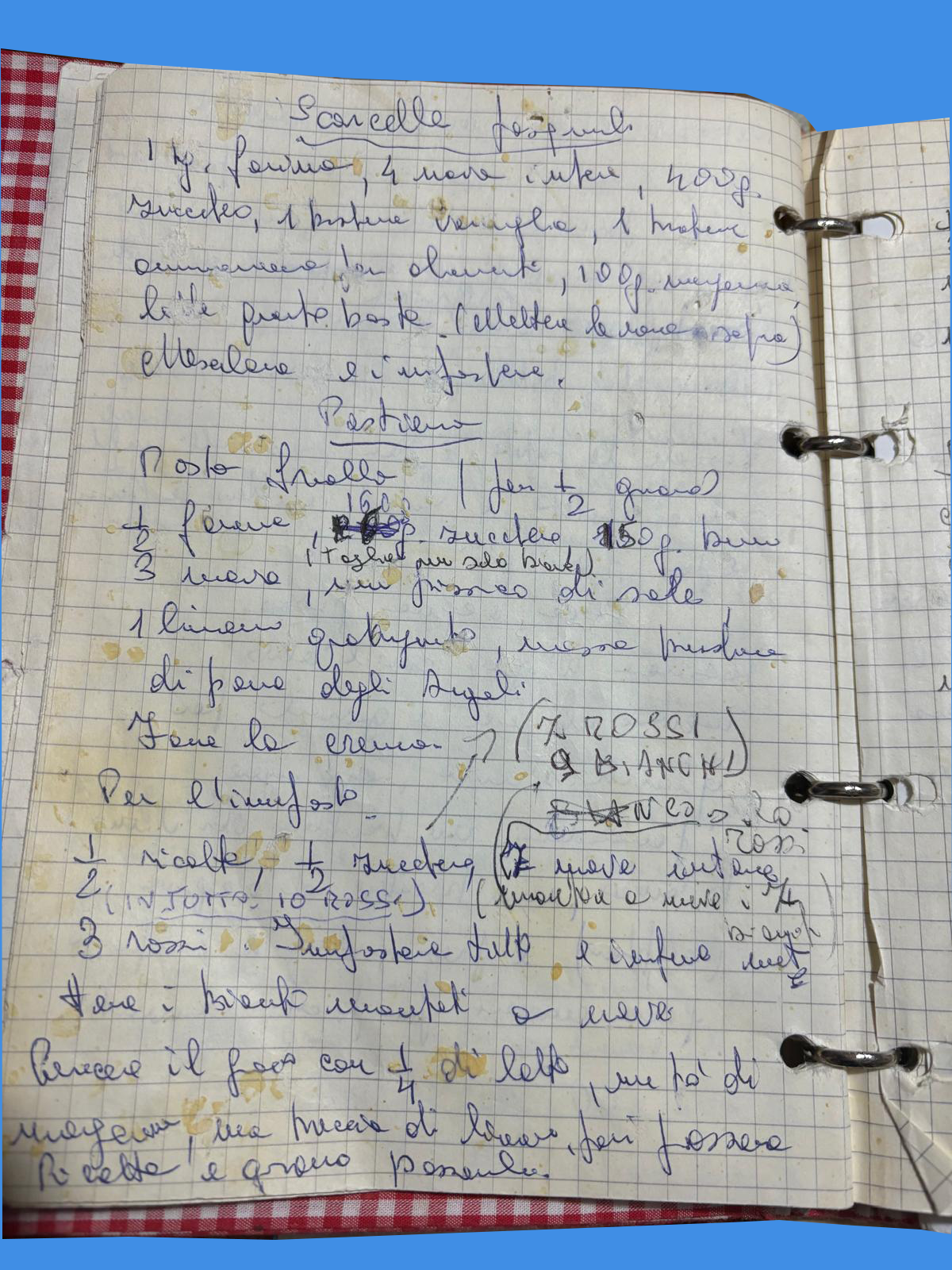 Ancora oggi queste ricette si ripetono come “immortali” e quei profumi di tradizione si rinnovano ad ogni festa, ad ogni tavolata dove i bambini di allora sono più che adulti e dove siedono nuovi adulti o ragazzi che chiedono a gran voce quei piatti nelle domeniche sempre meno frequenti in cui ci si ritrova attorno al tavolo di legno anch’esso tramandato di casa in casa, che sembra per due ma diventa per dieci come per magia. Perché un quaderno di ricette conserva il tempo e lo rinnova, diventa una traccia del passato che sopravvive al tempo moderno, alle ricette veloci nel microonde, alle trasmissioni innumerevoli di famosi chef.