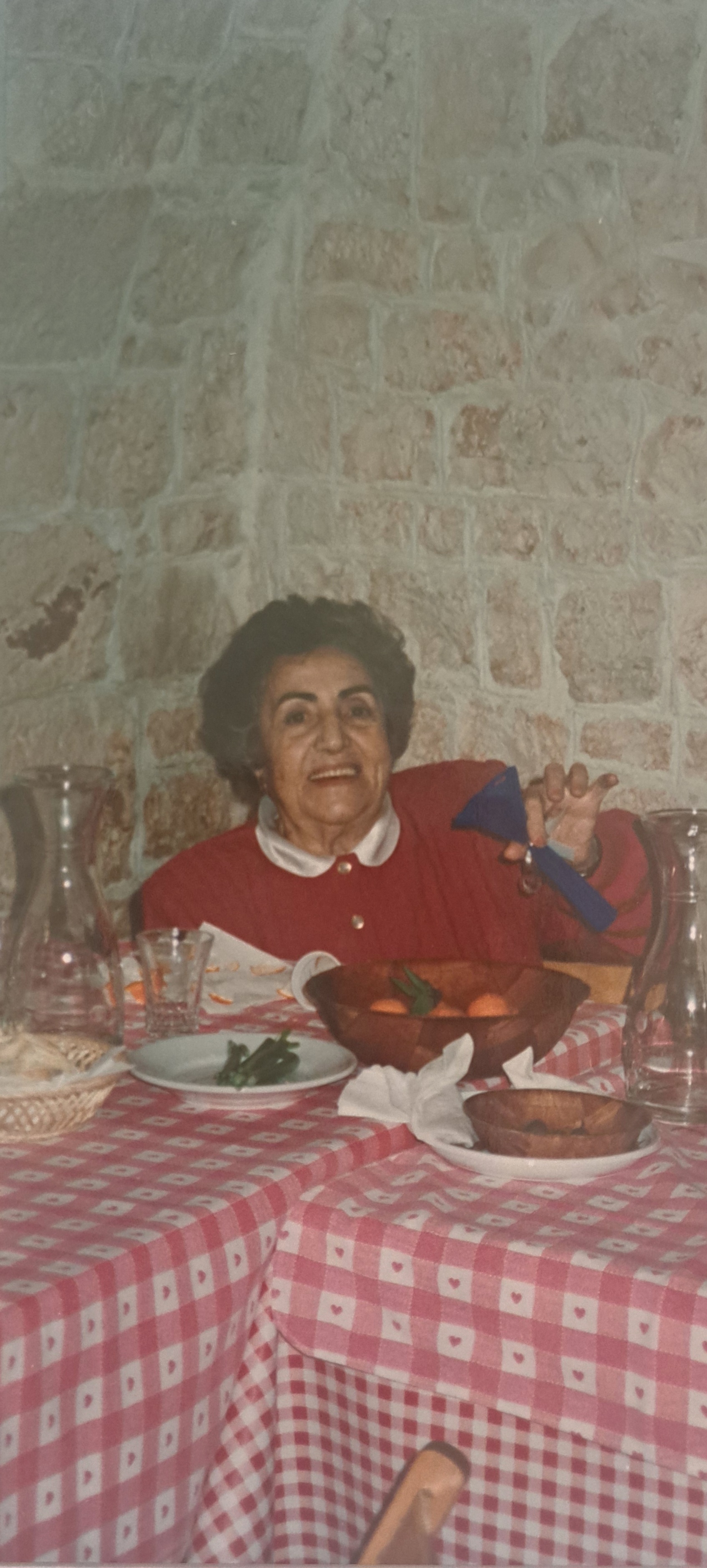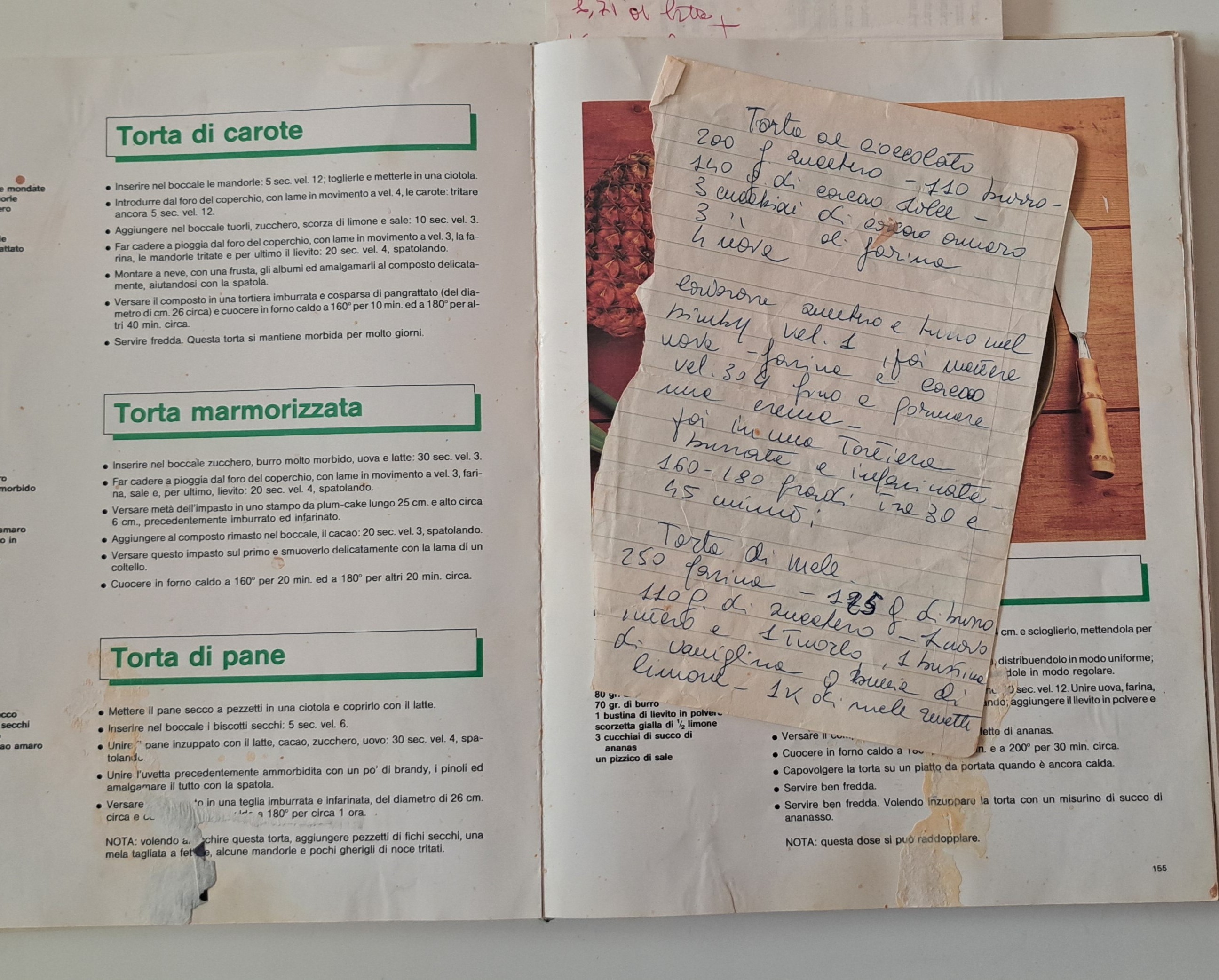 Indimenticabili le ricette dei dolci, di cui era, purtroppo per lei, ghiotta: la charlotte, il tiramisù, i profiteroles, ovviamente in aggiunta alle ciambelle e crostate già citate. Ogni pagina di quel ricettario aveva le impronte della sua padrona. Infatti nostra nonna era molto attenta al fatto che il fondo delle teglie dovesse essere rigorosamente imburrato “per non far attaccare sotto”, così ci spiegava. E con quelle mani unte lei poi girava le pagine del suo ricettario o seguiva le righe delle ricette, lasciando tante belle ombre sulle pagine che erano il suo timbro di fabbricazione. Come dimenticarla, china sul tavolo che leggeva e impartiva a noi nipoti gli ordini per la bilancia, per farina o zucchero, per il misurino del latte, per le uova. E lei che faceva il controllo finale delle quantità come una vera chef!. E poi a turno l’aiutavamo a versare il contenuto dolce cremoso nella teglia e non vedevamo l’ora che la posasse per andare a fare la scarpetta con le dita, avide di dolce, che erano più potenti di ogni spugna. Il sapore della vanillina era inebriante nel palato anche meglio del dolce dopo la cottura ed il profumo mentre era in cottura dava a tutti noi la soddisfazione del lavoro svolto. Ma bisognava stare sempre in guardia con quel forno, per non rovinare tutto. E allora lo stecchino che affondava nella crema fatta pasta morbida, per capire se era il caso di togliere la teglia e farla raffreddare. Spesso al dolce, dopo averlo appena cotto e ancora caldo, mancavano una o due fette. Non si riusciva ad aspettare che si raffreddasse. Era brava nostra nonna perché era precisa, concentrata sul suo libro di ricette. Certi giorni, soprattutto la domenica, era instancabile: si partiva con la pasta al forno con ragù e polpettine o le lasagne al forno, poi si passava al secondo con il roast beef o il maiale al latte e sul dolce era una certezza. Se non c’era tempo per farlo, bastava scendere e fare 200 mt a piedi e si prendevano i pasticcini da Fanelli o con la macchina si andava alla pasticceria GM. Noi nipoti sempre intorno un po’ per approfittare e mangiucchiare mentre si cucinava e un po’ per imparare, con le risate tra noi che non mancavano mai. Come facevi a non sorridere quando vedevi le sue mani sporcarsi di cioccolato, uova e burro mentre preparava il ripieno della charlotte e per finire con la panna montata che trovavi sul cucchiaio di legno o nei bordi dello sbattitore e nelle sue dita! Ancora oggi, lei rivive nei nostri modi di dire, nell’imitazione che facciamo di lei, di alcune sue frasi celebri, o imprecazioni quando perdeva la pazienza.