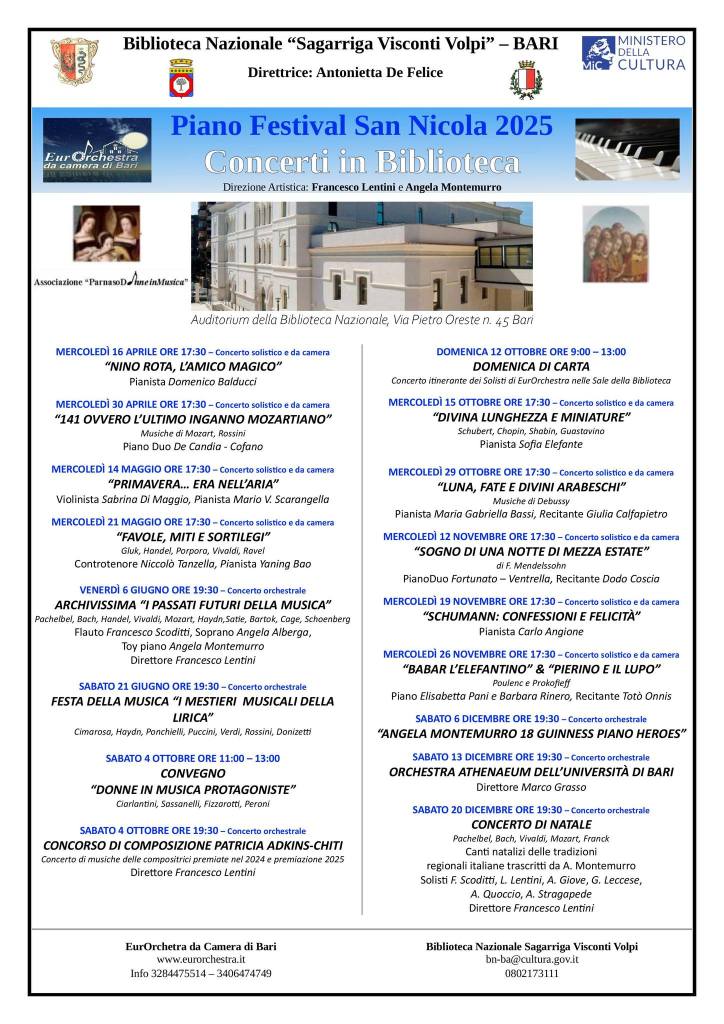 Prenderà così il via, nell’Auditorium della Biblioteca, la nuova stagione dei “Concerti in Biblioteca” dell’ EurOrchestra, nell’ambito del Piano Festival 2025 San Nicola. Si avvicenderanno, sempre a ingresso libero, concerti pomeridiani, (solistici o da camera) dati all’ora del tè, alle 17,30 e concerti serali, (orchestrali), alle 19,30. La direzione artistica è affidata ai Maestri Francesco Lentini e alla nostra amica e preziosa collaboratrice della rubrica Musica del nostro Blog, Angela Montemurro.
