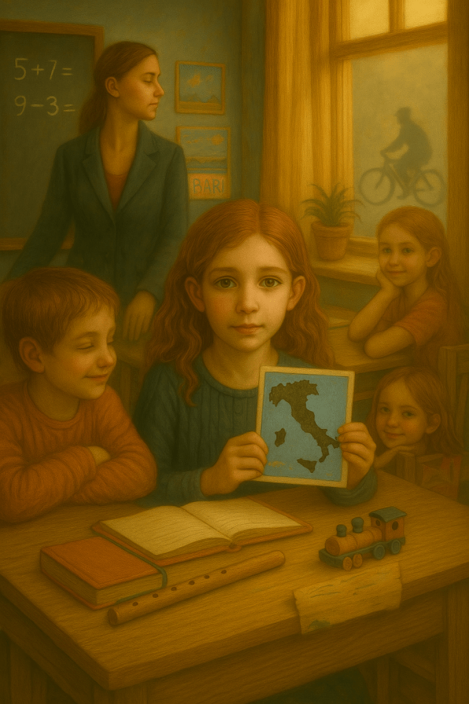 Con l’approssimarsi delle feste natalizie e pasquali la piccola spediva cartoline ai miei zii con lo schizzo dello stivale ed un trenino che arrivava a Bari, poi, crescendo, incominciò a renderci partecipi del sogno di una sua fuga verso Bari . Alla fine, per evitare guai peggiori, tra cui casi di tbc nel mio istituto, mi convinsi a chiedere il trasferimento. Così mia figlia terrona era e terrona, ostinata e felice, è rimasta.