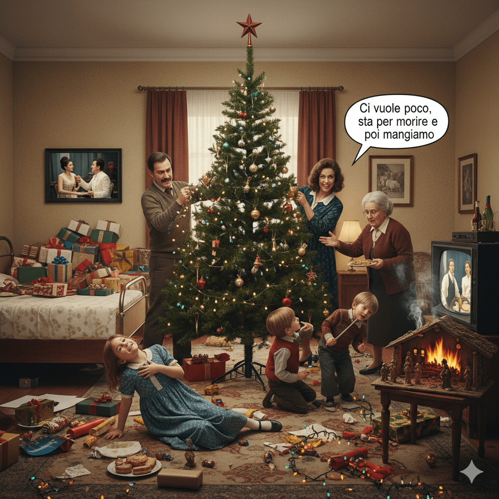 L’albero tocca il soffitto, le palle vengono tolte di nascosto, i regali entrano in casa con un “sotterfugio da complici incalliti” e il presepe… prende fuoco. Ma il culmine si raggiunge a tavola, quando lo zio melomane impone l’Opera e la zia, di fronte alle liti infantili, incoraggia a “una sopportazione affamata” con la frase cult: “Ci vuole poco, sta per morire e poi mangiamo”.