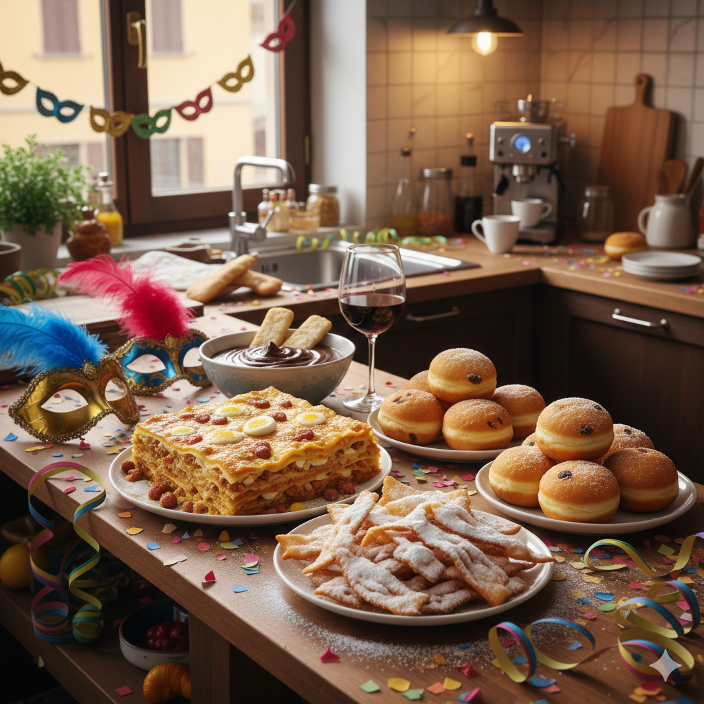 La vista delle vetrine delle pasticcerie addobbate con coriandoli, stelle filanti e vassoi colmi di chiacchiere imbiancate di zucchero a velo, di golose frittelle con la crema e senza crema e di altre leccornie, oltre a riattivare la memoria delle nostre papille gustative, ci rimanda all’infanzia, al tempo in cui bastavano un paio di baffi disegnati per essere Zorro, una stella luccicante per diventare lo sceriffo della città oppure un velo azzurro sulle spalle e una bacchetta per sentirsi una fatina.
