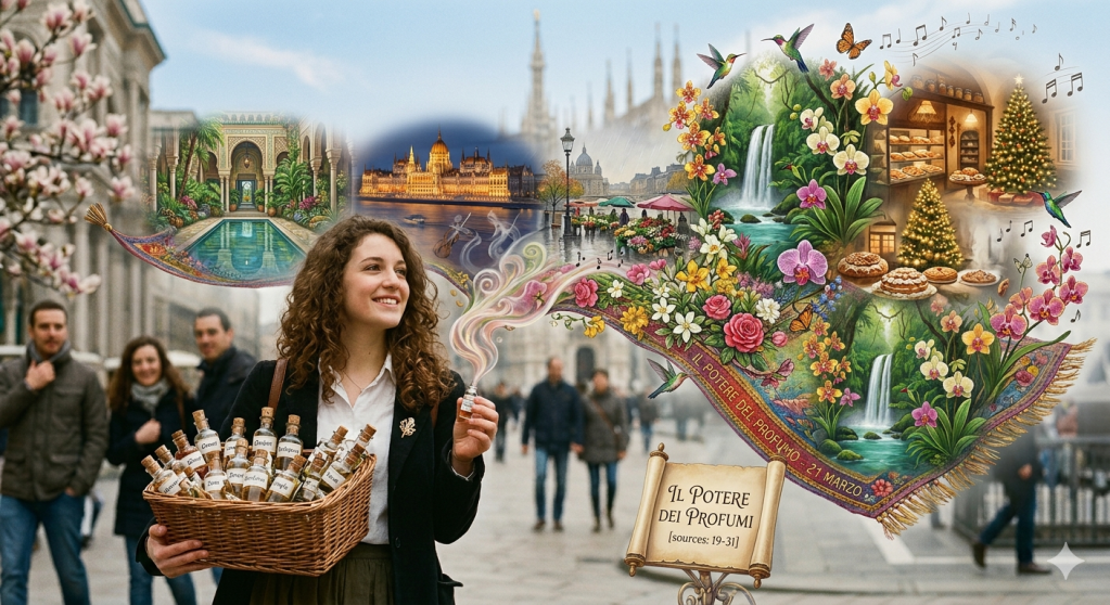 In questo brano, l’incontro con una giovane studentessa in piazza Duomo a Milano diventa il pretesto per un viaggio sensoriale senza confini. Attraverso il suo racconto, scopriamo come un’essenza possa trasformarsi in un “tappeto volante”, capace di trasportarci istantaneamente da un palazzo orientale ai mercati di fiori lungo la Senna, fino al calore speziato delle cucine di un tempo.
