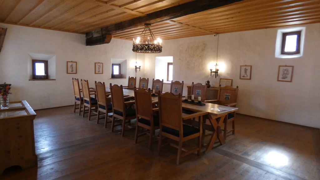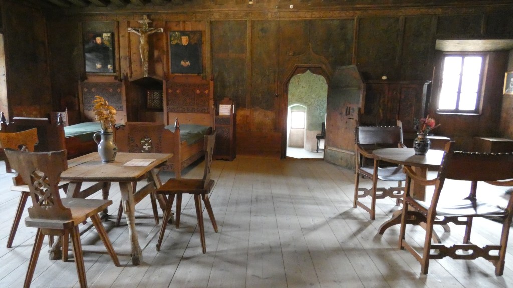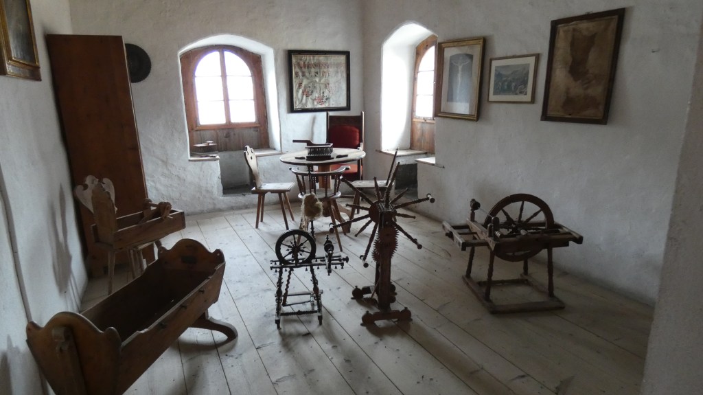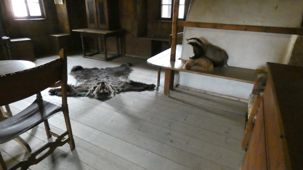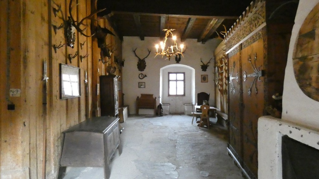 Al borgo di Tasso, stanze e saloni rigorosamente in legno erano semplicemente arredati con cassettoni, madie, secrétaires e alcuni dipinti dei proprietari del ’500, oltre a teste di caprioli, stambecchi e cervi alle pareti, in armonia con le attività del territorio montuoso.