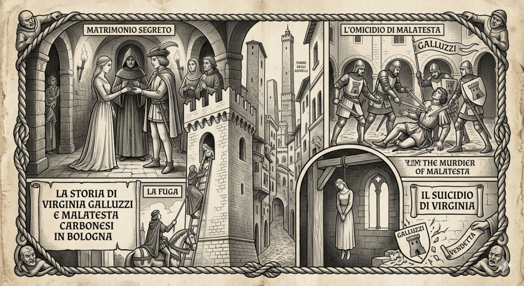 Dentro quella torre crebbe Virginia Galluzzi. Figlia del cavaliere Paolo Galluzzi e di donna Erminia Bentivogli, Virginia apparteneva a una delle famiglie più schierate della Bologna del tempo. Siamo nella seconda metà del XIII secolo, negli anni in cui la città è divisa da una frattura profonda: guelfi contro ghibellini, papato contro impero. I Galluzzi stavano da una parte, i Carbonesi dall’altra. È una linea di demarcazione che va oltre la politica e attraversa le case, le alleanze, i matrimoni. E stabilisce cosa si può fare e cosa no.